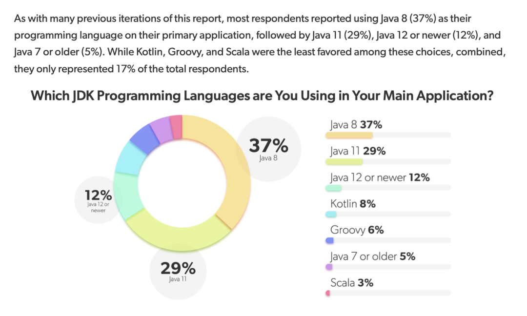 看了下 JRebel 于 2022 年的 Java 生产力报告,如今 Java 8 的使用率仍是第一、Java 11 其次,越来越多的小公司开始尝试使用 Java 11。