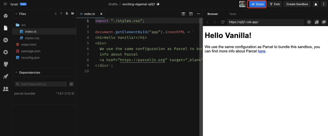 创建好沙箱后,你就可以在线编辑代码、实时查看效果,或者分享沙箱给其他小伙伴啦~
