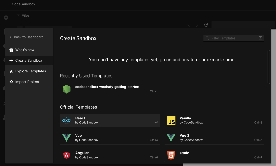 在这里你可以基于丰富的模板来创建自己的沙箱(项目),比如 React、Vue、Angular、VuePress、Svelte 等常见的前端框架:
