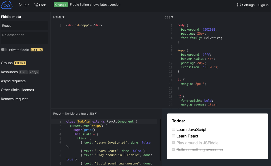 当你在网上看到了一段不错的 JS 代码或者插件,不必再下载到本地了。直接把代码粘贴到 JSFiddle 中,就能以最快的方式查看运行效果了。现在很多前端组件库也用到了这种平台,给开发者所见即所得的体验。