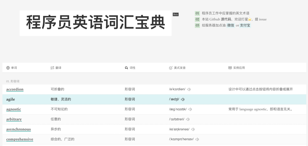 直接面向程序员的英语词汇手册。该手册收集了计算机书籍、文档、文章中高频常见的技术词汇。最终目的是希望程序员集合自身的英语基础,在掌握列表中的词汇后,可以无障碍阅读英语技术文章和文档。