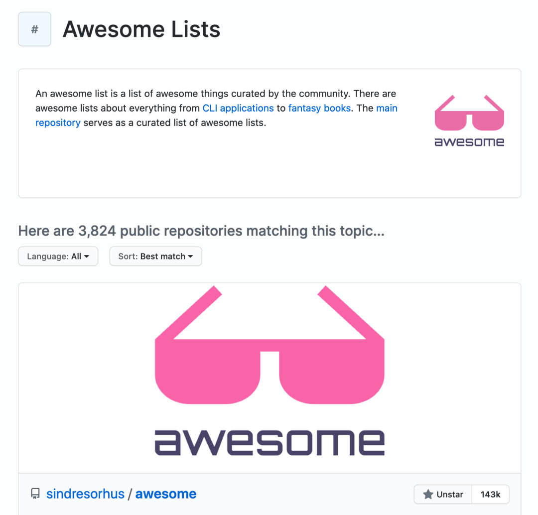 随着Awesome项目越来越多,GitHub成立了 Awesome Topic 专区,在专区内,我们可以快速发现各种Awesome项目,进而发现不同编程语言或技术的优秀开源项目。
