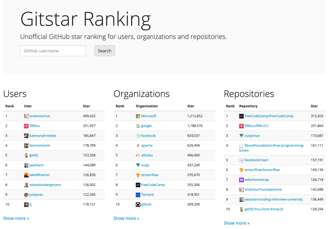 非官方的GitHub排行榜,按照star数进行排序,支持个人、组织和项目排行。能够发现成熟又活跃的优秀项目。