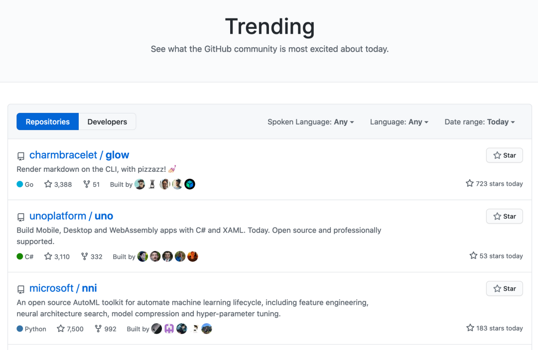 GitHub官方提供的项目趋势统计,能够看到一段时间内项目和开发者新增star数的排行。还支持选择语言、编程语言及时间范围。适于发现最新的有潜力的项目。