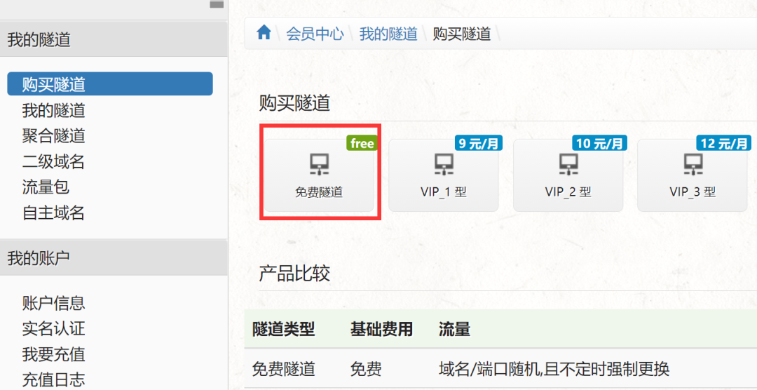 用法非常简单!打开官网,注册登录后,先新建一个隧道。大多数情况下,选择免费隧道就足够了: