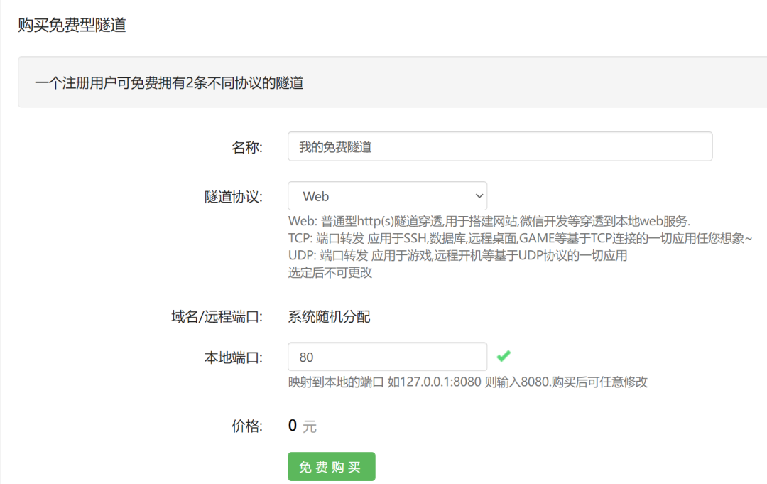 选定隧道类别后,需要填写隧道的配置,像支持的协议、本地端口等。举个例子,假如你在自己电脑的 3000 端口启动了个前端 web 项目,那隧道协议就选择 Web、端口选择 3000。