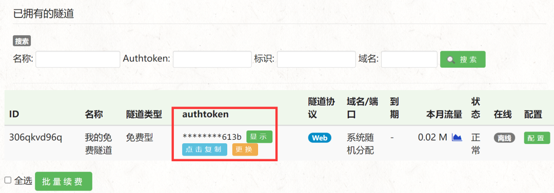 创建好隧道后,可以得到一个 authtoken ,相当于密码,后面启动隧道要用到: