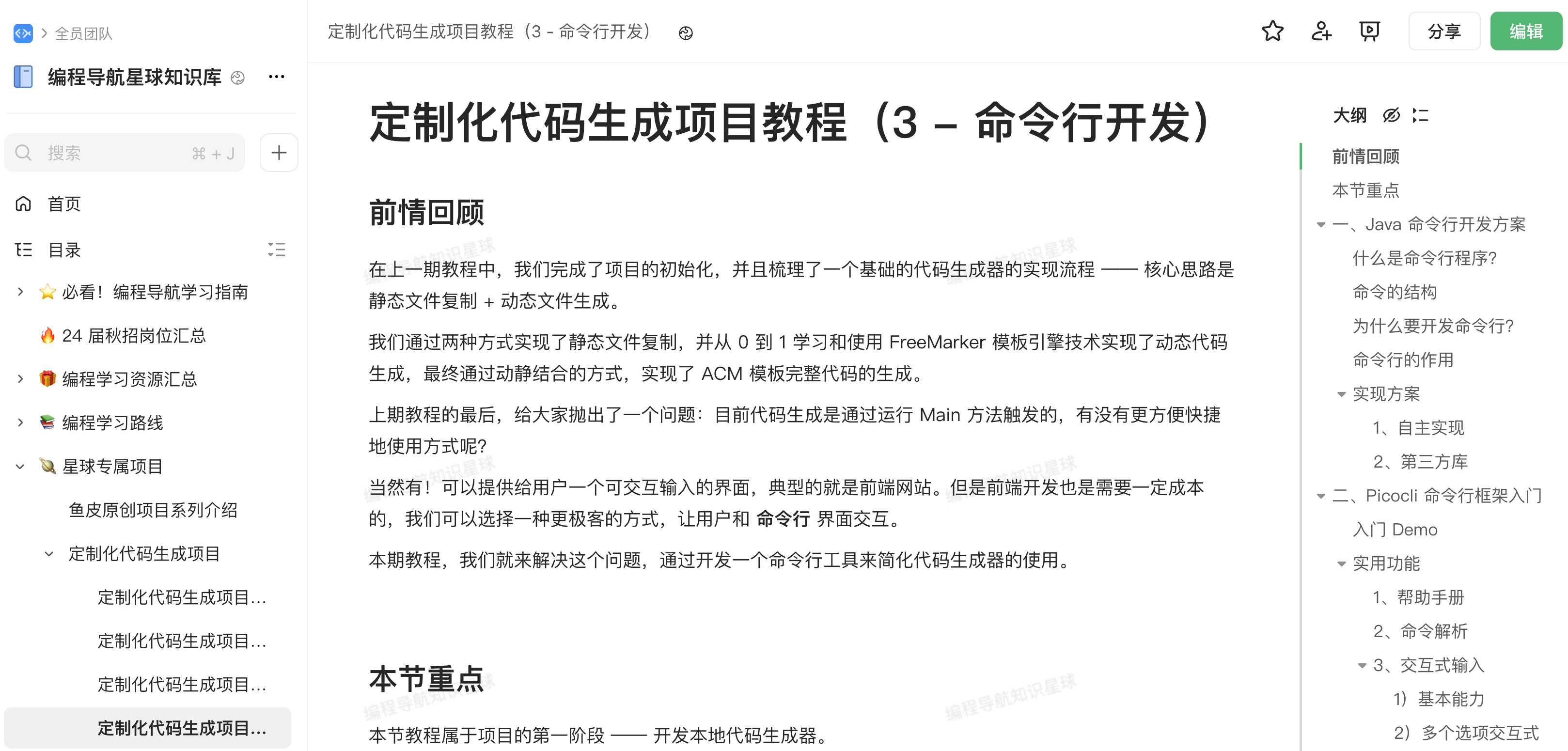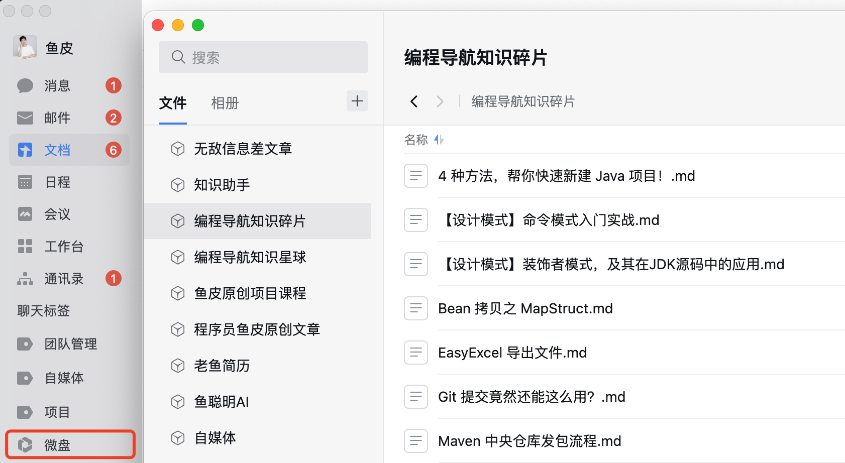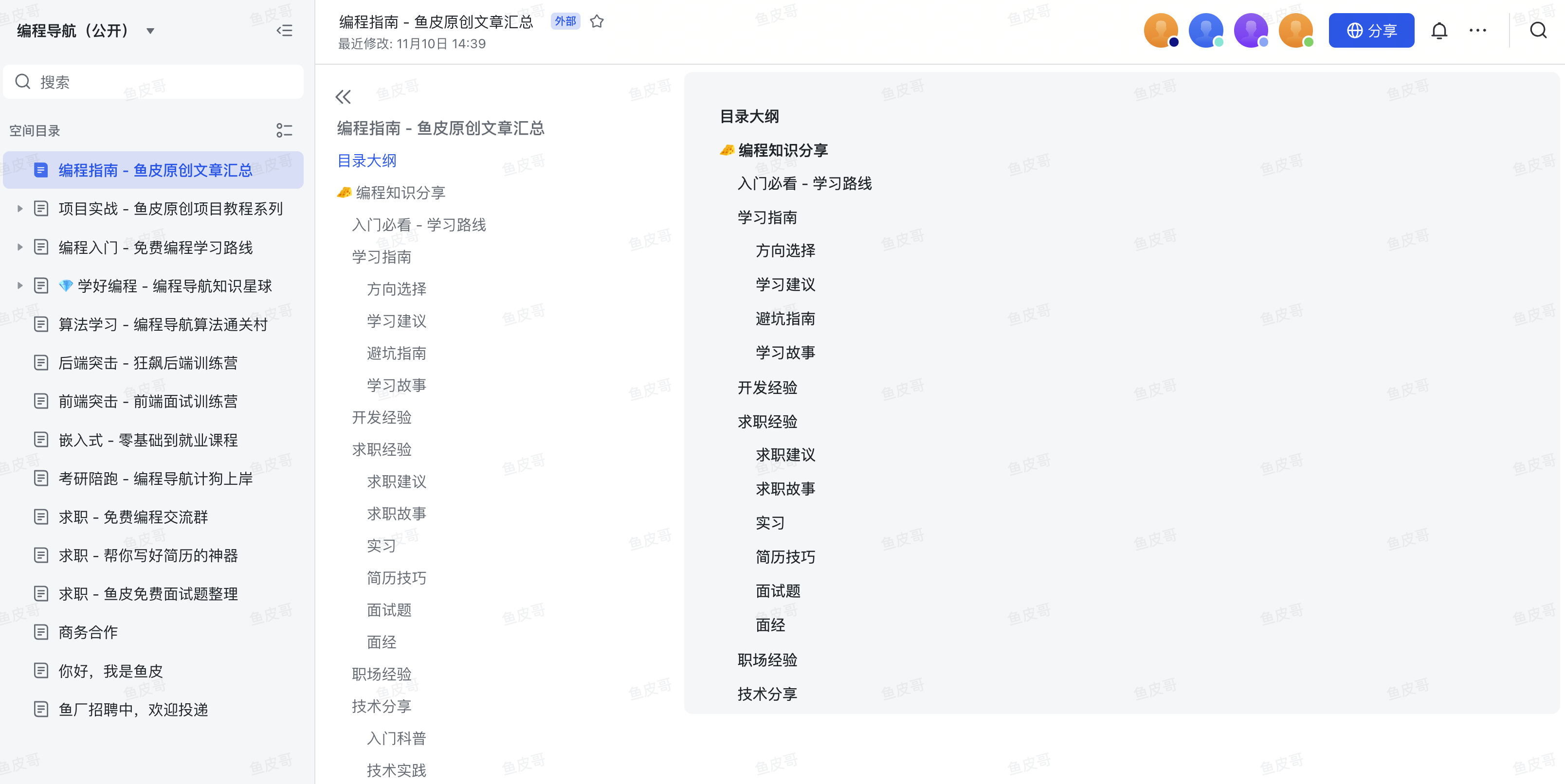 如果要整理和公开多个文档合集,那么腾讯文档的体验就没那么好了。而 飞书 的优点是实时编辑体验好,并且支持公开分享知识库(多个文档),比较利于传播。所以我们一般用飞书来进行对外公开的知识分享,比如鱼皮的原创文章系列分享(http://dogyupi.com)。