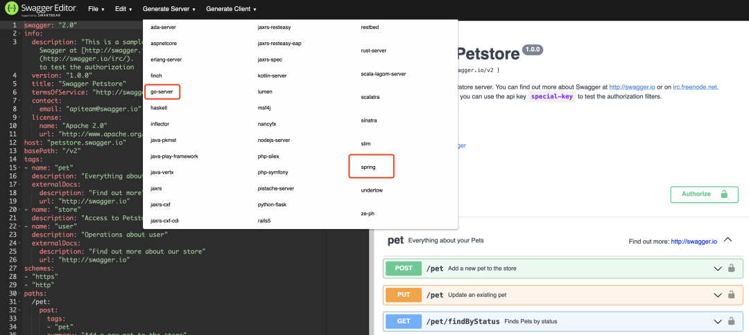比如直接在官方提供的 Swagger Editor 里写好接口的 json 配置,然后一键就能生成主流后端语言的服务端和客户端代码了,六的一批!