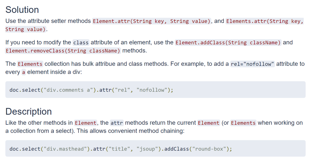 此外,jsoup 还有处理网页数据的功能,也很简单,跟着官方文档提供的示例代码,很轻松就能上手~