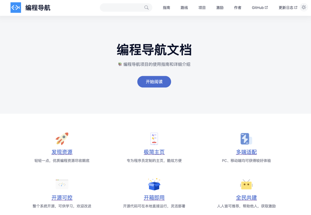 Dumi 生成的网站很精简,而且封面支持自定义特性的展示,因此也很适合作为项目或产品的官方文档。我的编程导航文档,就是用 Dumi 生成的: