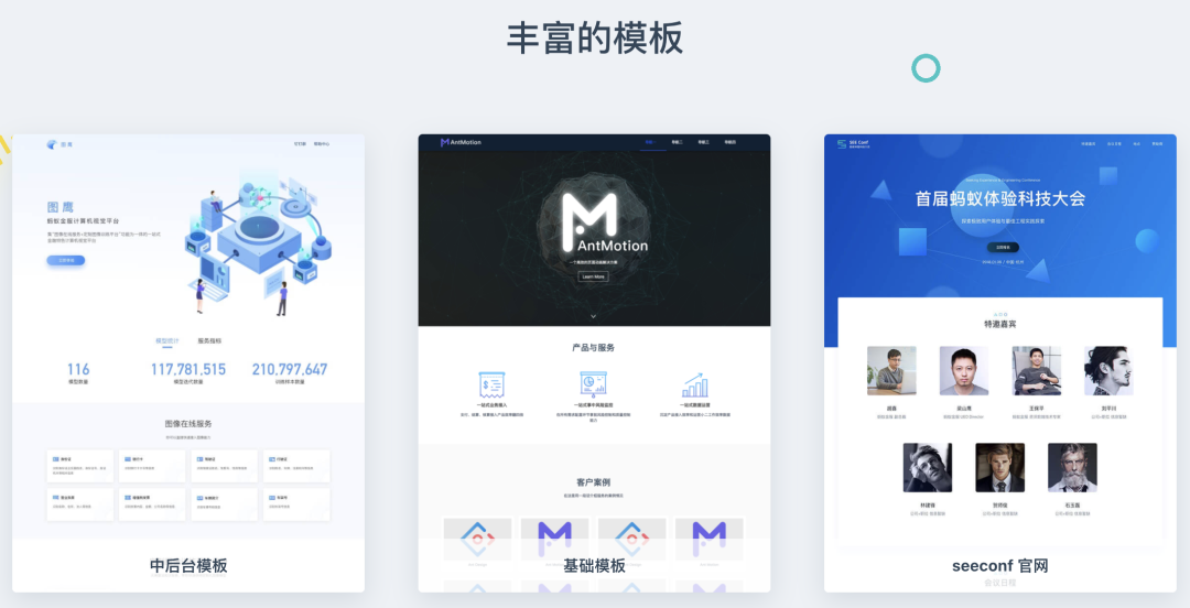 蚂蚁开发的网站首页生成器,平台提供了丰富的首页模板,可以快速帮我们上线专属网站首页。