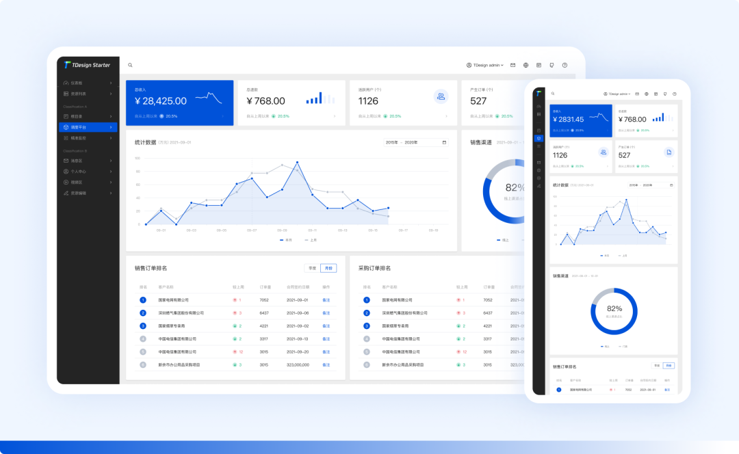 此外,TDesign 还提供了开箱即用的脚手架 TDesign Starter,只需输入几行命令,就能快速搭建出一个多端适配的中后台管理系统,效果如下图: