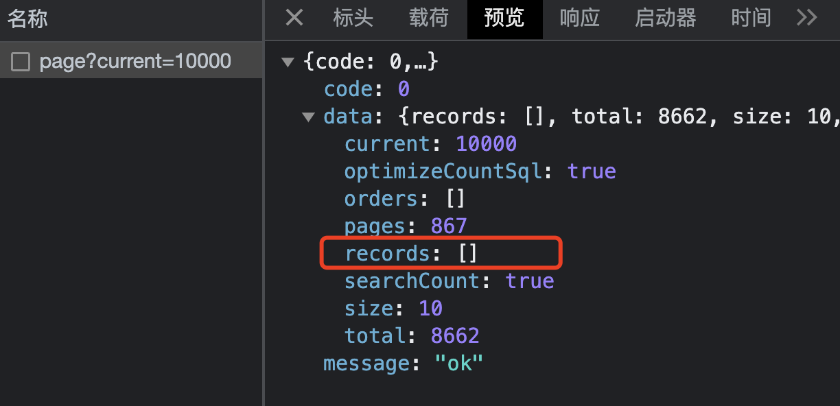 比如 MyBatis Plus 的分页查询中,如果 records 属性的 size 大于 0,表示数据库返回了数据,那么就不用再排查数据库查询的问题了;而如果 size = 0,就要分析为什么从数据库中查询的数据为空。
