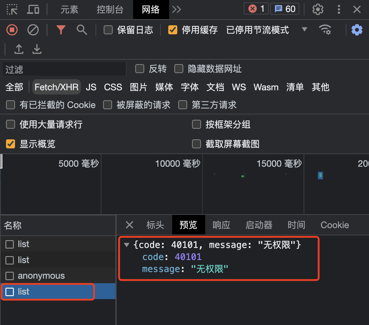 选中请求并点击预览,就能看到后端返回结果,有没有返回数据一看便知。
