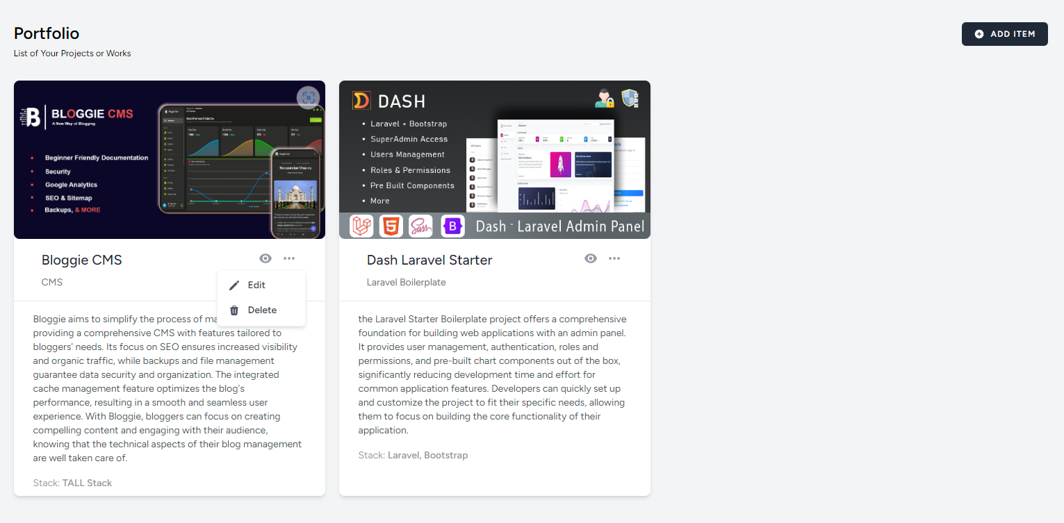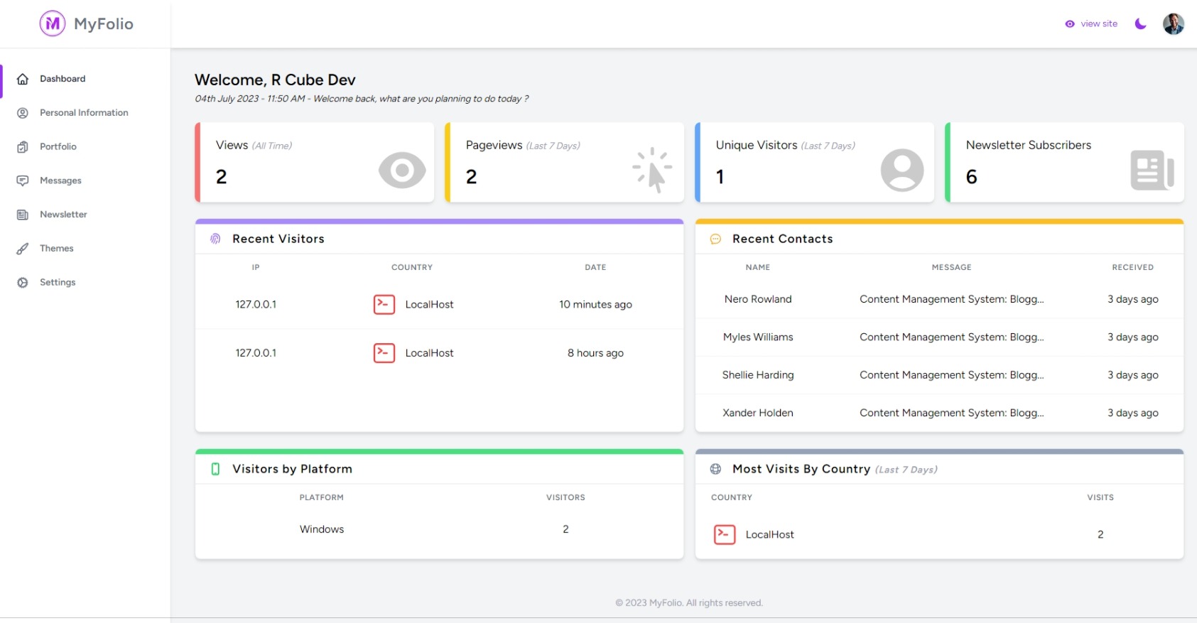 MyFolio is a PHP based Web Application designed to empower users like you to effortlessly create and maintain your very own personalized website or portfolio. Myfolio is build using Laravel 10 (latest version), with its cutting-edge technology and user friendly interface, Myfolio takes the complexity out of web development, making it accessible to users of all skill levels.