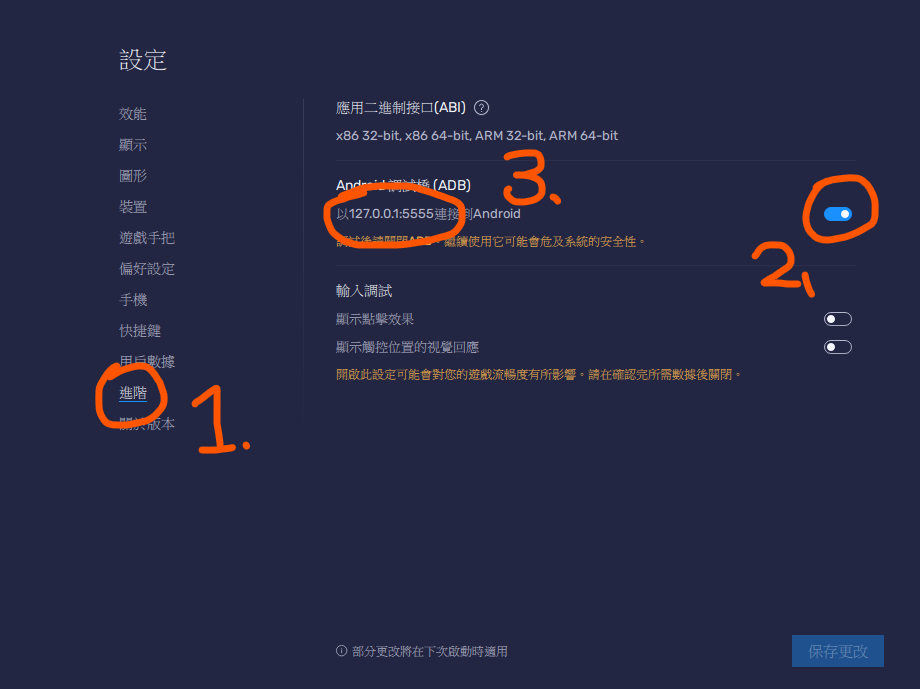 adb功能在設定=>進階=>Android調試橋(ADB),勾選後會看到路徑。