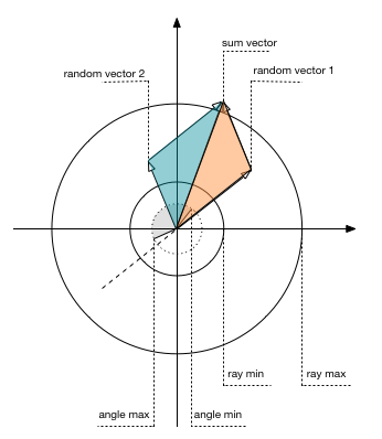 The script generates a vector (random vector 1) inside the minimum and maximum ray. Then generates another vector (random vector 2) with an angle between minimum and maximum angle from the first one and with a length between minimum and maximum ray.