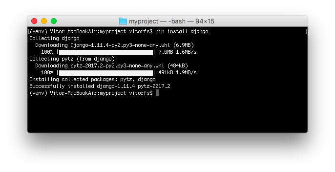 现在我们来安装以下 Django 1.11.4 ,因为我们已经开启了虚拟环境 venv ,因此,这操作会非常的简单。我们将运行下面的命令来安装 Django :