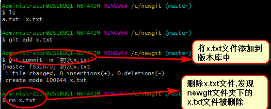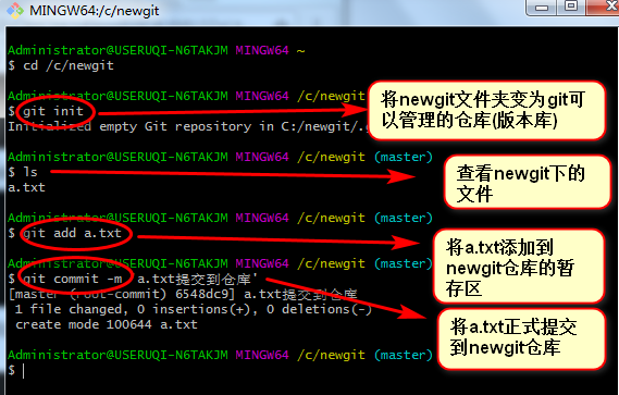 git commit -m 'a.txt提交到仓库' // 将a.txt正式提交到newgit仓库(本地仓库)