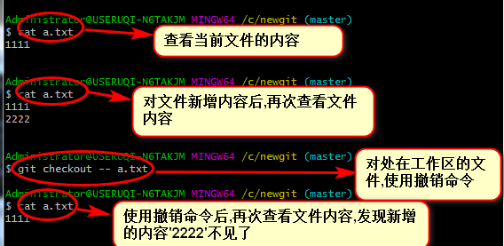 对修改的文件,如果未提交到版本库,可以使用撤销命令,来撤销修改